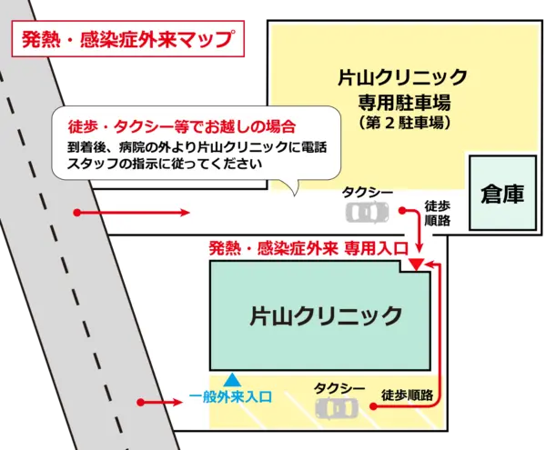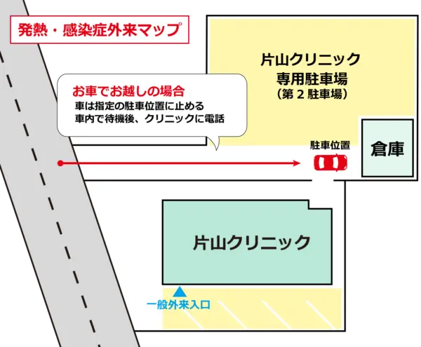 ご予約されたお時間に「片山クリニック専用駐車場(第2駐車場)」側にお越しいただき、「発熱・感染症マップ」記載の指定の場所に駐車いただき、そのまま車内で待機してください。